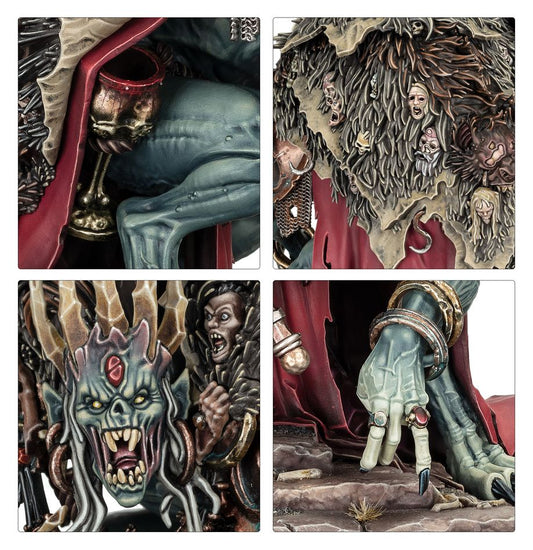 The Flesh-Eater Courts faction in Warhammer Age of Sigmar are a horrifying and tragic race of cannibalistic ghouls, deluded by a grand illusion of nobility and chivalry. Once human, these creatures have been transformed by the corrupting influence of necromantic magic and the dark power of their abhorrent leaders, the Ghoul Kings. These kings, twisted by madness, believe themselves to be virtuous monarchs presiding over grand courts, and their delusions are shared by their monstrous followers. The Flesh-Eater Courts roam the Mortal Realms, driven by an insatiable hunger for flesh, attacking settlements and feasting on the living. Their armies are composed of grotesque creatures like the skeletal Crypt Ghouls, the fearsome Crypt Horrors, and the monstrous Terrorgheists and Zombie Dragons. Despite their macabre appearance and bloodthirsty nature, they are driven by a perverse sense of duty and honor, seeing themselves as righteous crusaders. This grim irony makes the Flesh-Eater Courts a uniquely tragic and terrifying force, embodying the twisted remnants of corrupted nobility.