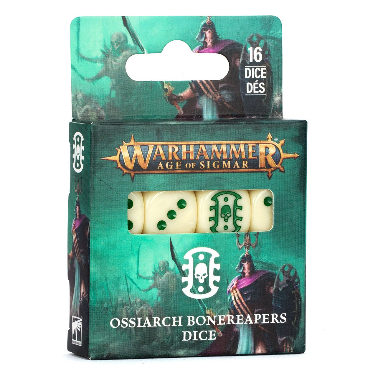 This is a set of 16 six-sided dice with rounded edges for use in games of Warhammer Age of Sigmar, themed around the Ossiarch Bonereapers. They are cast in ivory marble-effect acrylic plastic with green ink markings, and measure 16mm along each edge. The 1-5 facings are traditionally pipped, and each '6' face is decorated with the lifeless icon of the Ossiarch Bonereapers. These themed dice are only available while stocks last.