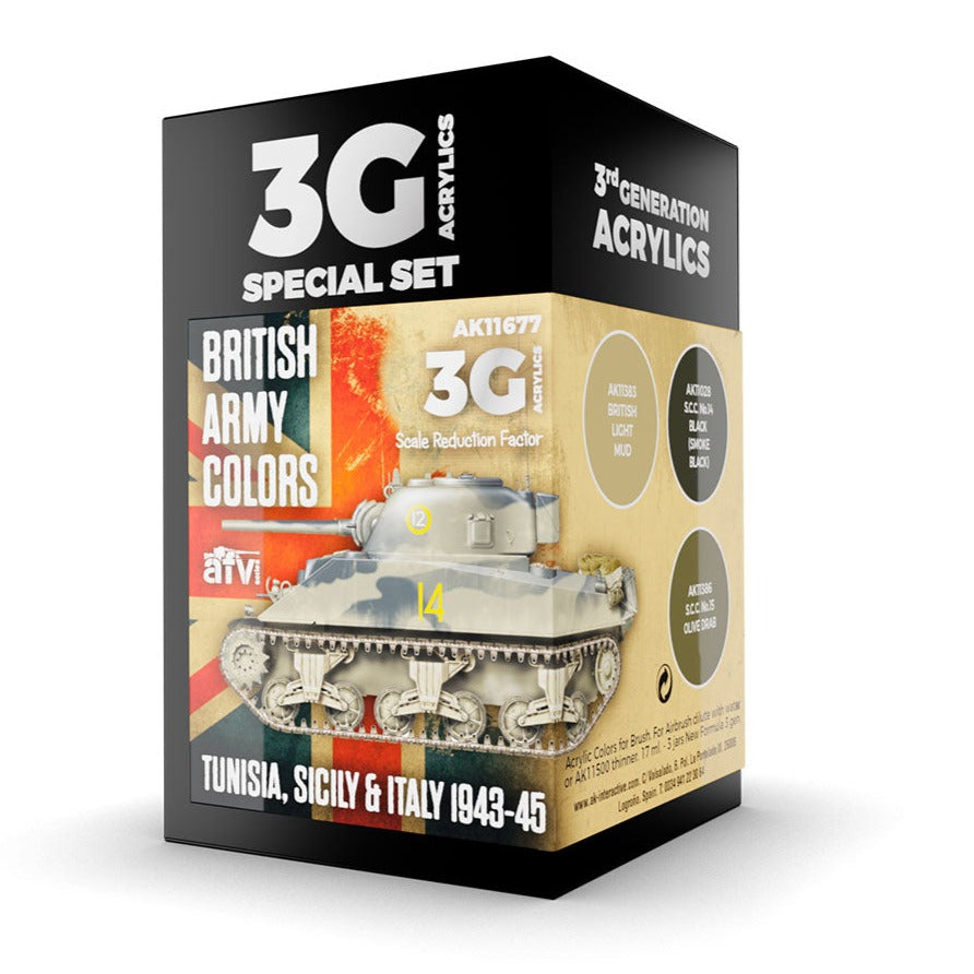 A special set of 3rd Generation acrylic paints including the three camouflage colors that were most commonly used for painting vehicles of British and Commonwealth forces deployed in Tunisia, Sicily and Italy from April 1943 (S.C.C. No.15 Olive Drab was introduced one year later) until the end of World War II.
