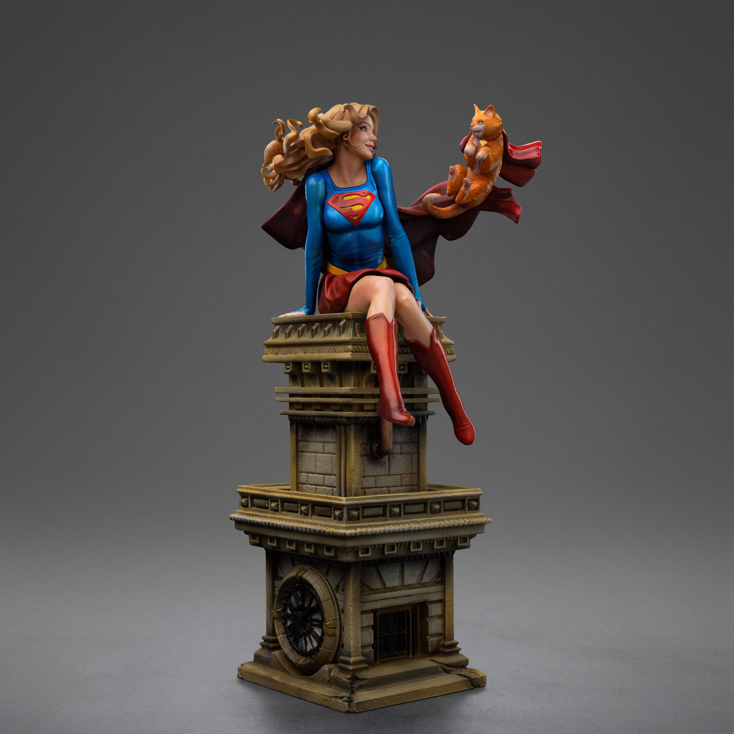 Perched atop the clock tower of a classic skyscraper, a beautiful young woman with golden hair, wearing a distinctive blue and red costume with the iconic "S" emblem on her chest, playfully interacts with her unique and special feline pet. As we gaze upon her, we are instantly transported to a whimsical and radiant atmosphere, capturing every detail of the young heroine and her companion, with perfect aesthetic fidelity to her classic portrayal in the comics. As part of the eighth series inspired by the most iconic characters from the DC Comics universe, Iron Studios proudly presents the "Supergirl Series #8 - DC Comics - Art Scale 1/10" statue featuring Superman's cousin alongside Streaky the Supercat, flying by her side in a fun and unpretentious pose that perfectly embodies her heroic and innocent essence.