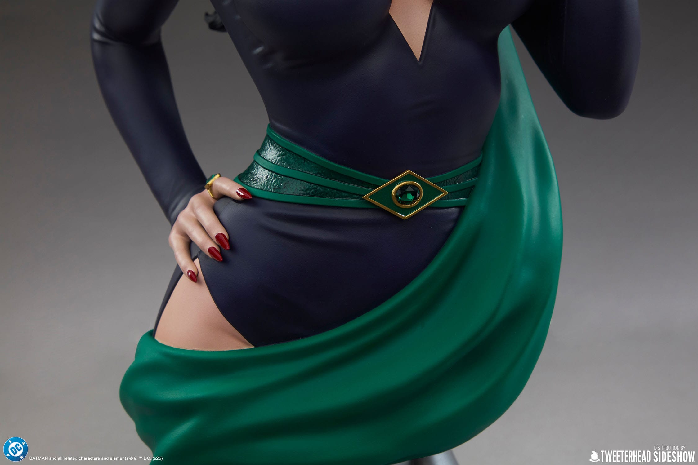 The Catwoman 1:3 Scale Bust measures 15.25" tall x 9.25" wide x 5.75" deep. This waist-up figure is fully sculpted and sits on a silver Art Deco-themed base evoking the signature architecture of Gotham City. Her classic purple bodysuit and cutout cat mask are accented by a green cape and sash. Catwoman's portrait boasts a confident expression, emphasized with bold red lips, a beauty mark on her cheek, and a flourish of eye makeup. Glittering glass gems are set in the feline cape pins, ring, and emblem on her belt, making Batman's cattiest rogue as lovely to behold as the treasures she steals.