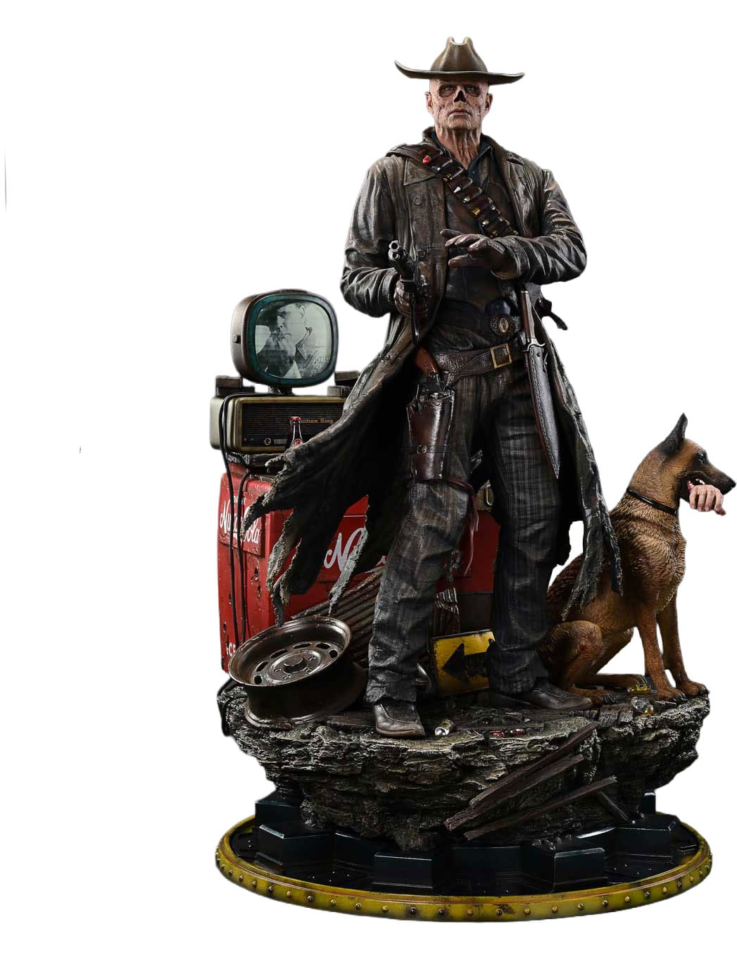 The specially designed base is composed to reflect his outlaw way of life. Dogmeat standing close at his side. A weathered Nuka-Cola refrigerator. A television with an LED-lit screen showing pre-war star Cooper Howard. Each element draws a story into your display.