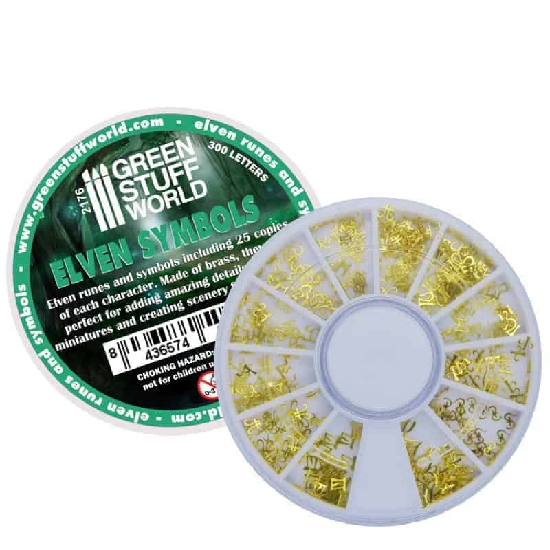 Collection of 300 elven-themed runes, symbols, and signs made of brass. There are 12 different types to choose from, separated into different compartments. They are perfect for adding details to armor, weapons, and banners of your models and miniatures or for decorating dioramas. We recommend using cyanocrylate glue in small quantities.