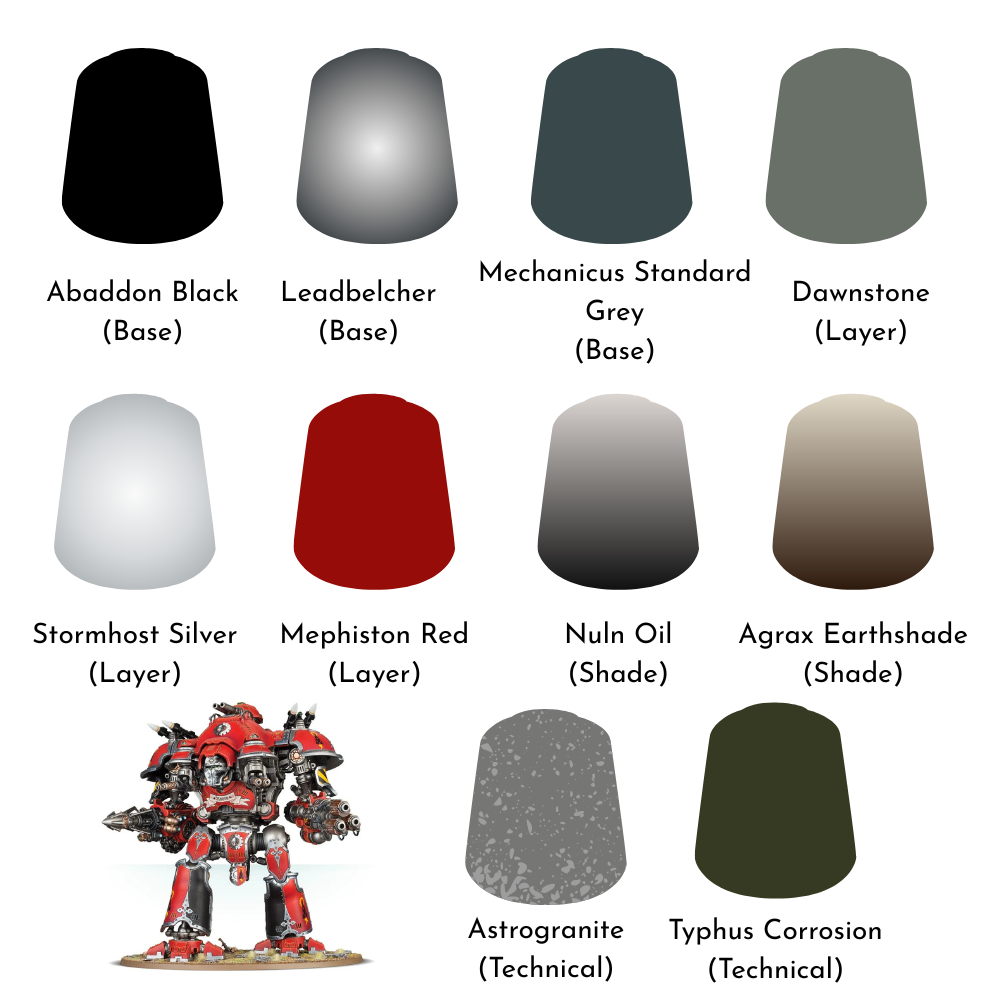 Mephiston Red delivers striking heraldry and spot colour, while Agrax Earthshade adds oil streaks and banner grime for a sense of long campaign service. Finish with Typhus Corrosion around the lower legs for realistic battlefield wear, and mount your Knight on Astrogranite to ground it in shattered terrain.