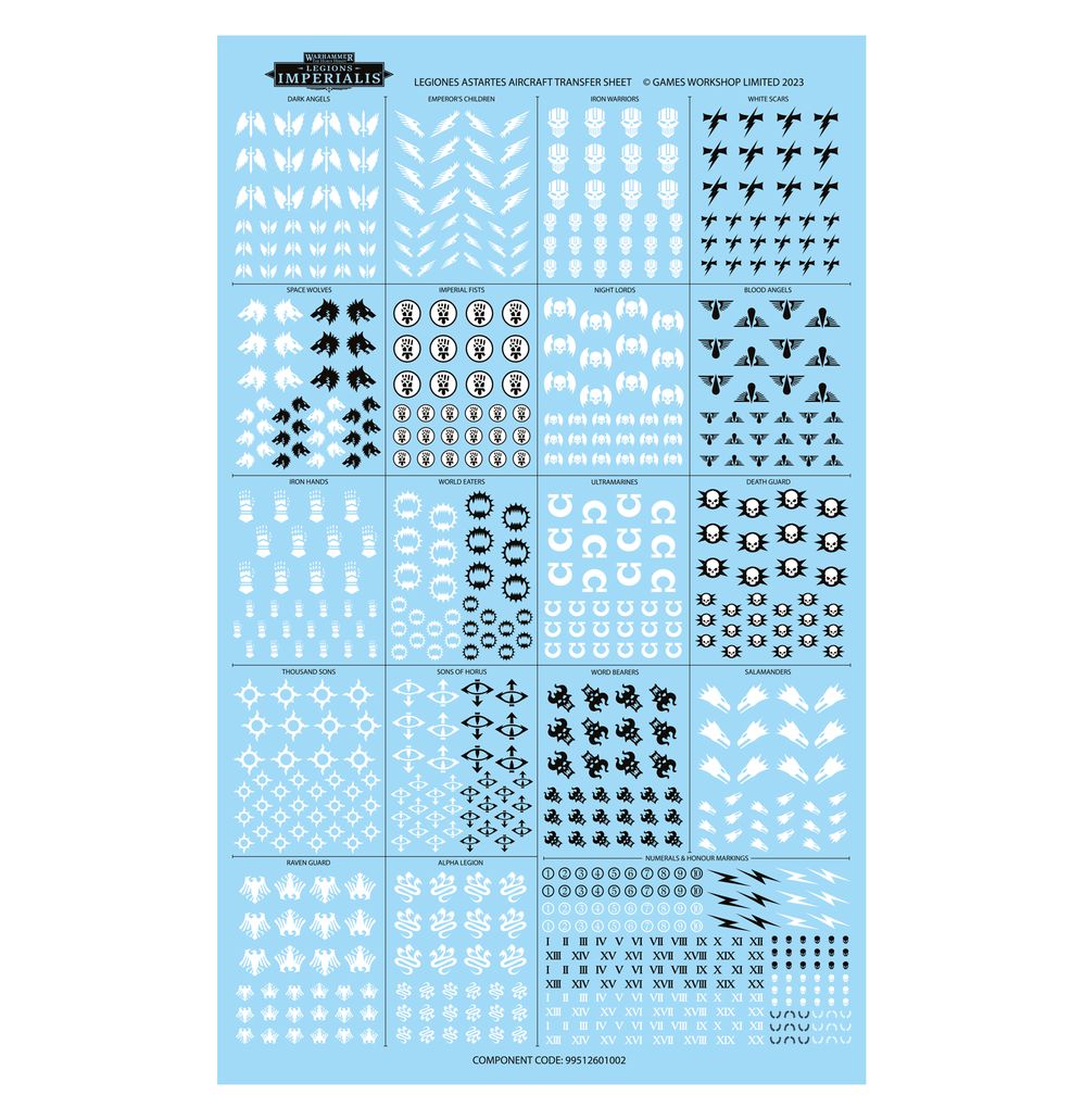 This kit is supplied with 3x Legion Vehicle Transfer Sheets, each containing 1,130 high-quality waterslide transfers, and 1x Legiones Astartes Aircraft Transfer Sheet, containing 748 high-quality waterslide transfers, to decorate your miniatures. There are icons for each of the 18 Legions in the Horus Heresy, along with numerals and honour markings.