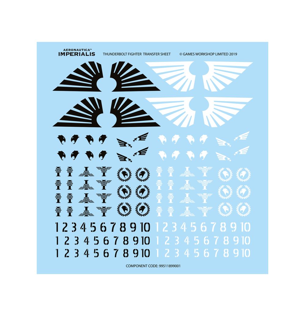 The kit also comes with 3x Solar Auxilia Vehicle Transfer Sheets, each containing 228 high-quality waterslide transfers, and 1x Thunderbolt Fighter Transfer Sheet, containing 136 high-quality waterslide transfers, to decorate your miniatures. They feature iconography for Cthonian Headhunters, Boremanite Devils, Arkadian Janissaries, Manachean Bulls, Saturnyne Rams, Lord Marshal's Own, Ash Scorpions, and the Deathless, along with numerals and other markings.