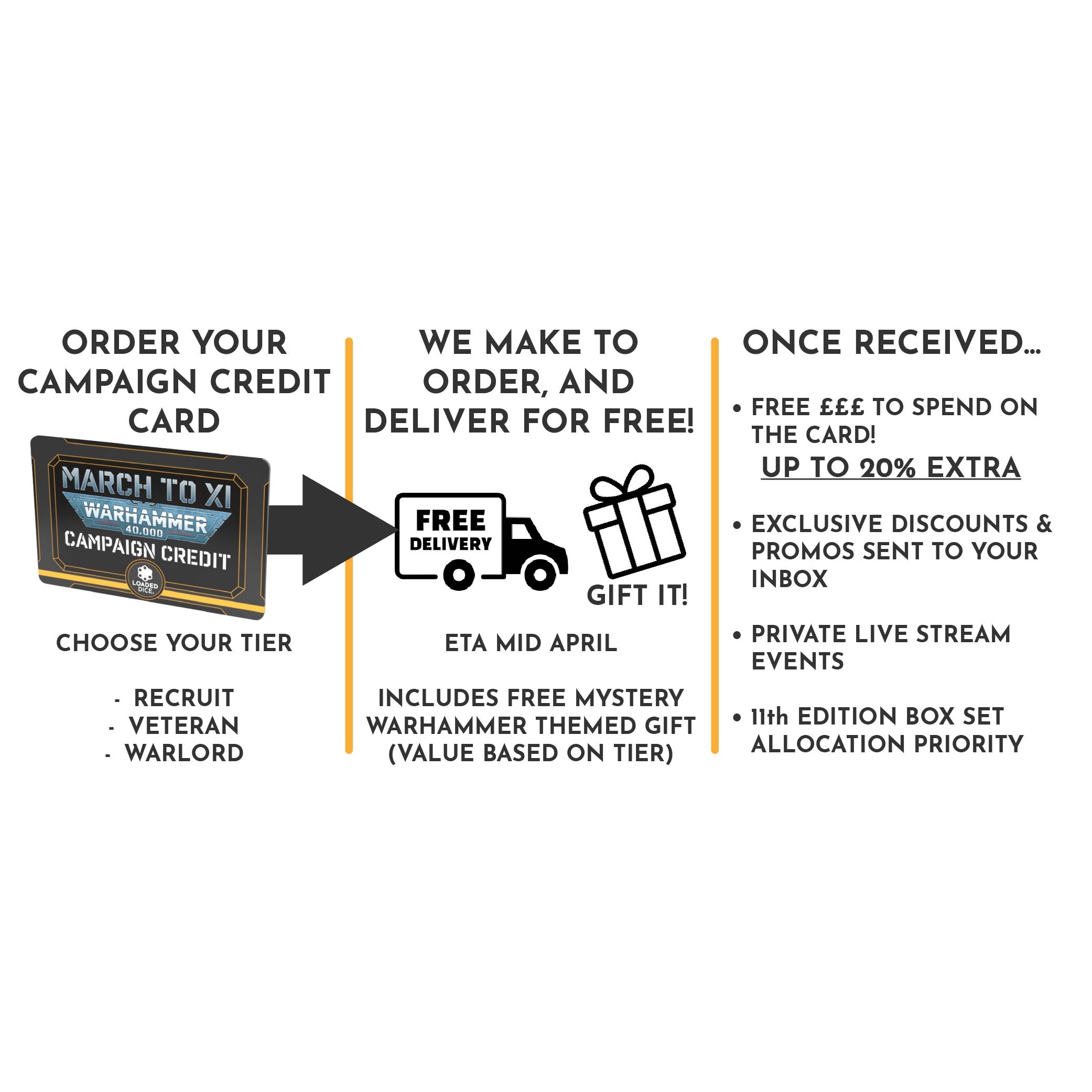 Introducing our limited, made to order 'Campaign Credit' card - an awesome collectible that unlocks savings, exclusive perks, freebies, and more as we march toward the launch of Warhammer 40,000 11th Edition