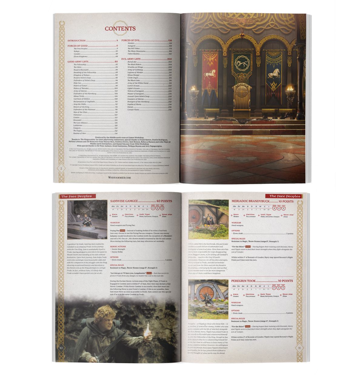 Good Army Lists: Photography, background information, army composition, additional rules, and special rules for the following 27 armies – The Fellowship, The Shire, Road to Rivendell, Breaking of the Fellowship, Kingdom of Rohan, Road to Helm's Deep, Defenders of Helm's Deep, Ride Out, Riders of Éomer, Riders of Théoden, Army of Edoras, Defenders of the Hornburg, Minas Tirith, Garrison of Ithilien, Reclamation of Osgiliath, Atop the Walls, Return of the King, Defenders of the Pelennor, Men of the West, Númenor, Lindon, Rivendell, The Last Alliance, Lothlórien, Fangorn, The Eagles, and Realms of Men.