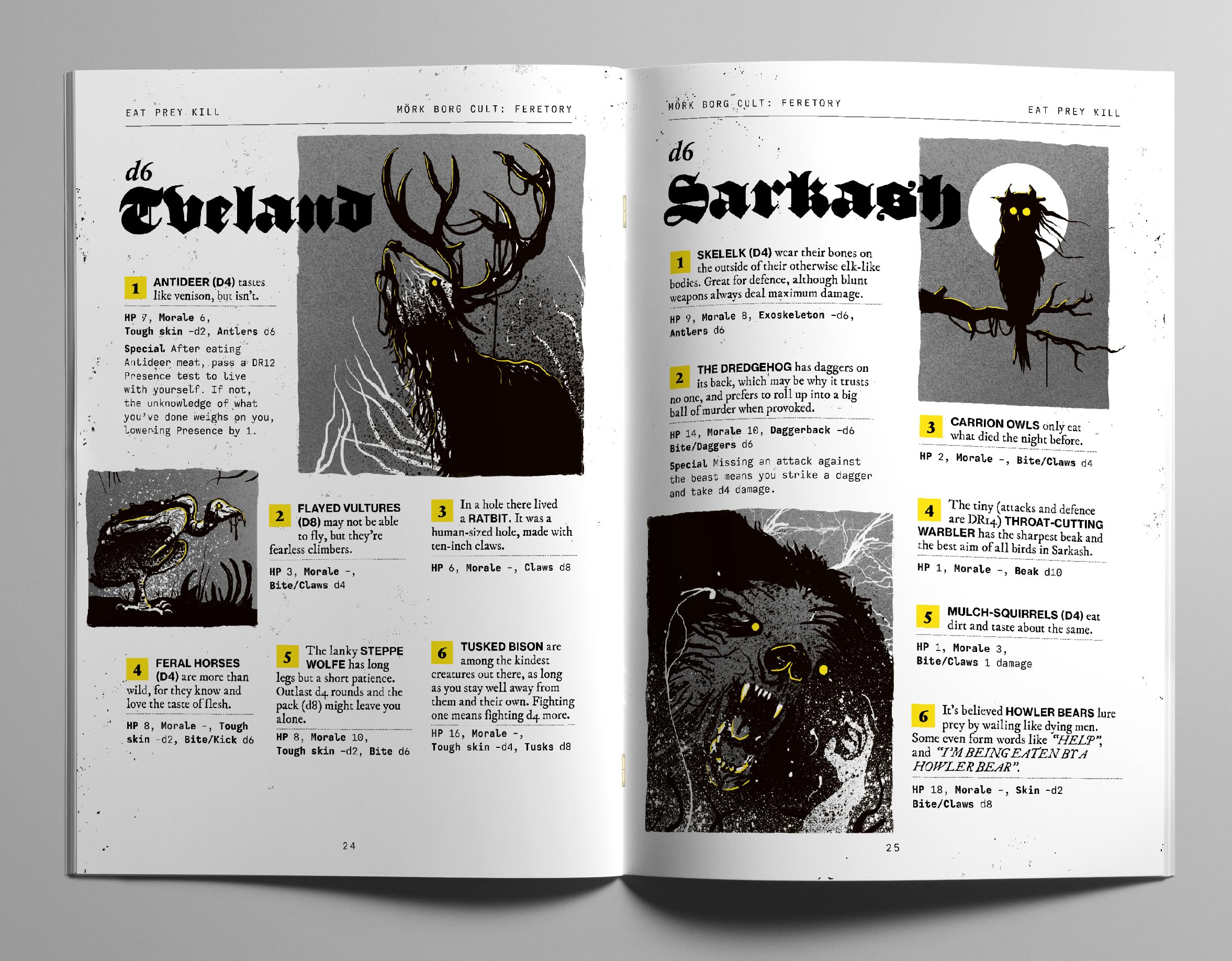 MÖRK BORG CULT: FERETORY is a collection of tables, monsters, items, classes, rules and ideas that you can use in your MÖRK BORG game, or any other rules-light osr-style game about deadly adventures, cursed treasure and terrible odds.