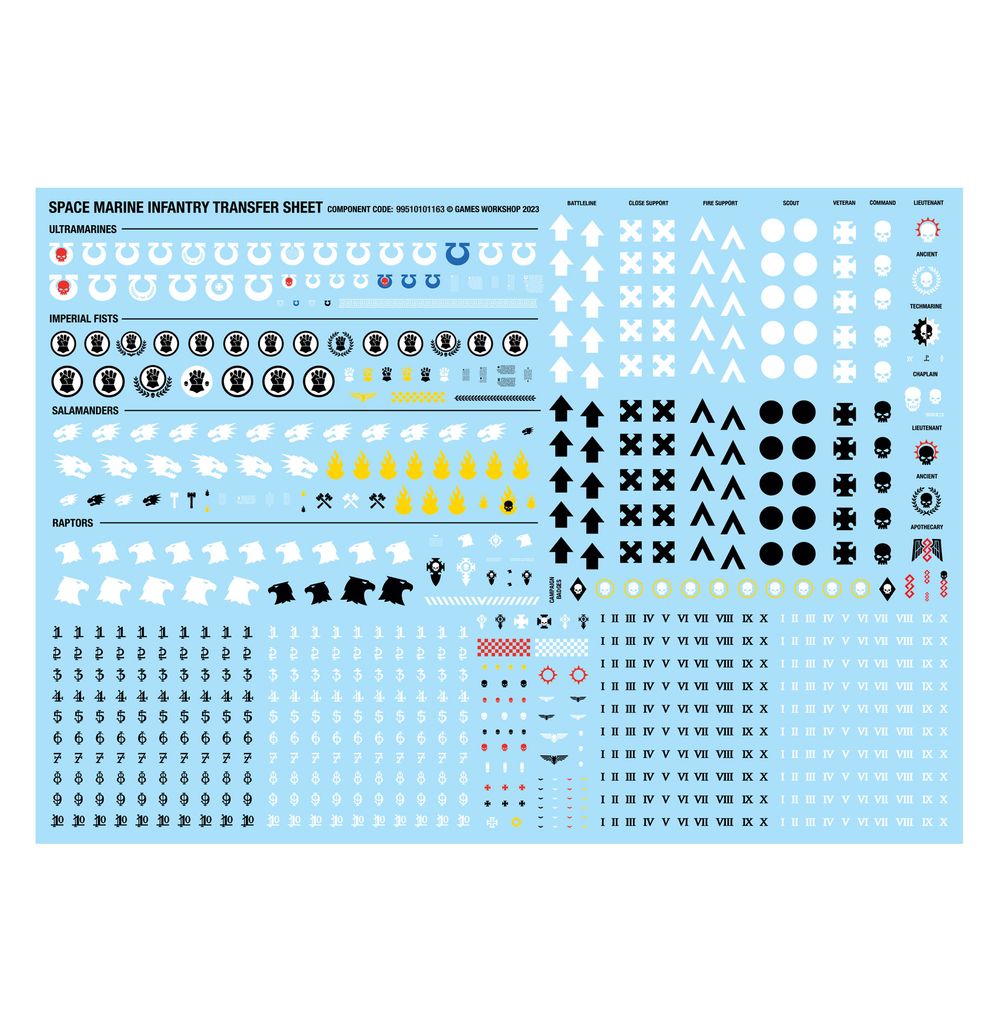 This kit is supplied with 1x Space Marine Infantry Transfer Sheet, containing 758x high-quality waterslide transfers. These include Chapter icons for the Ultramarines, Imperial Fists, Salamanders, and Raptors, along with battlefield role indicators, numbers, numerals, and more.