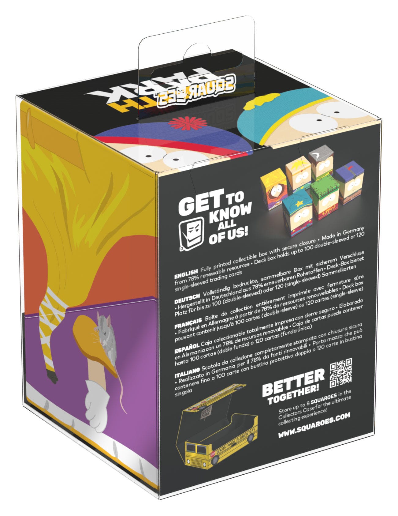 Collectible box for storing TCG decks, tabletop gaming accessories, and/or collectibles. The Stan Squaroe from the South Park™ edition holds up to 100 cards in double protective sleeves if used as a deck box. Squaroes are made from 78% renewable recources and fit perfectly into the separately available Collectors Case.