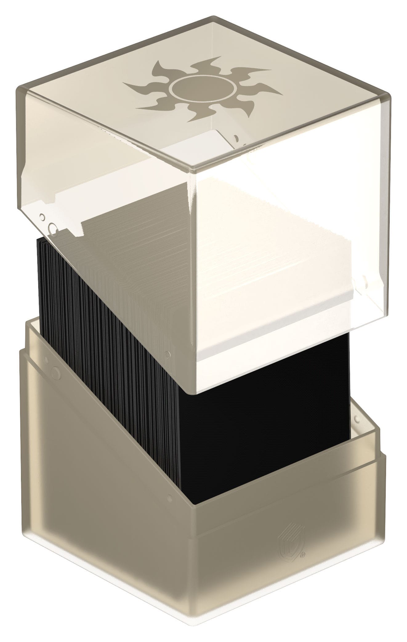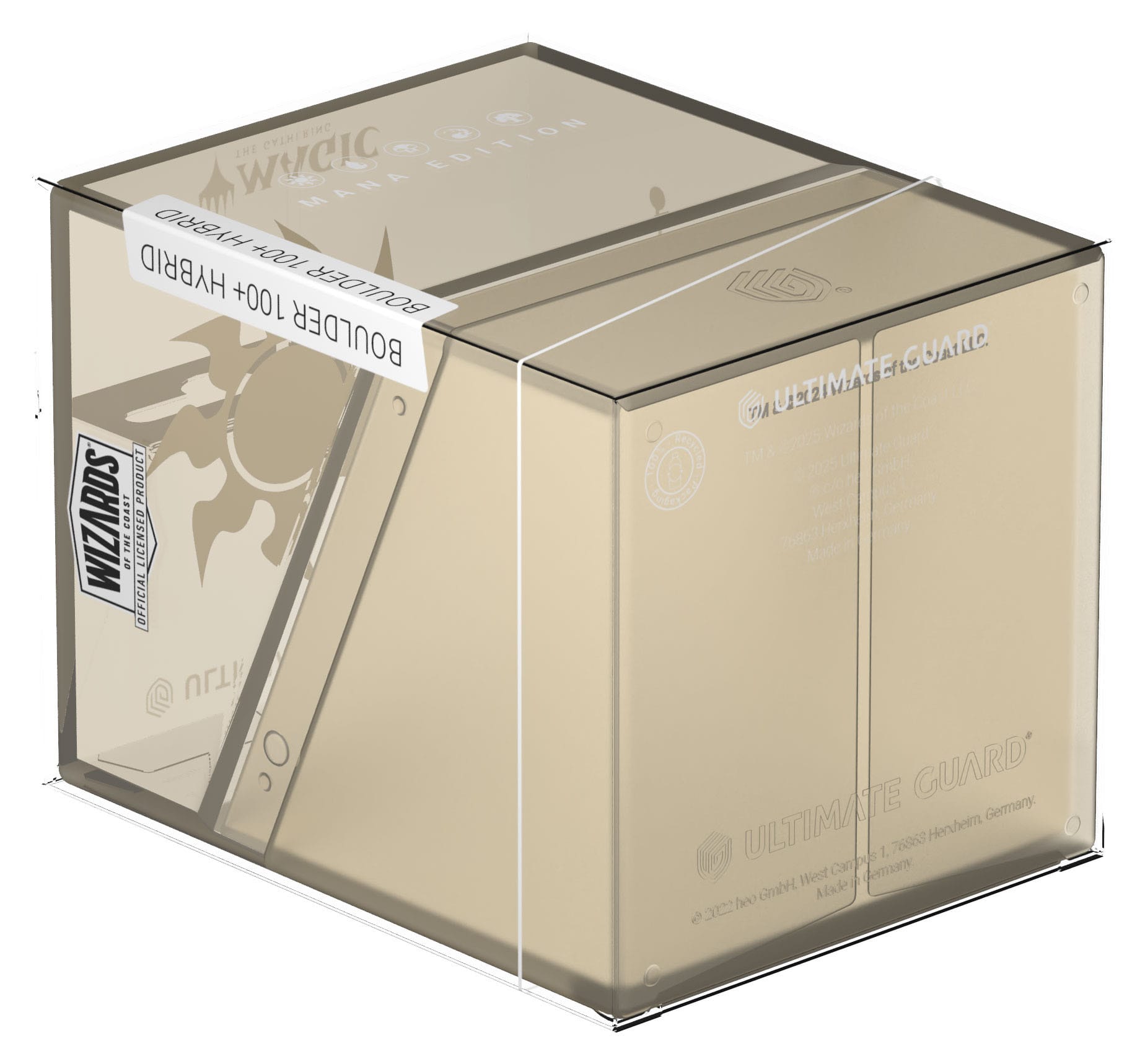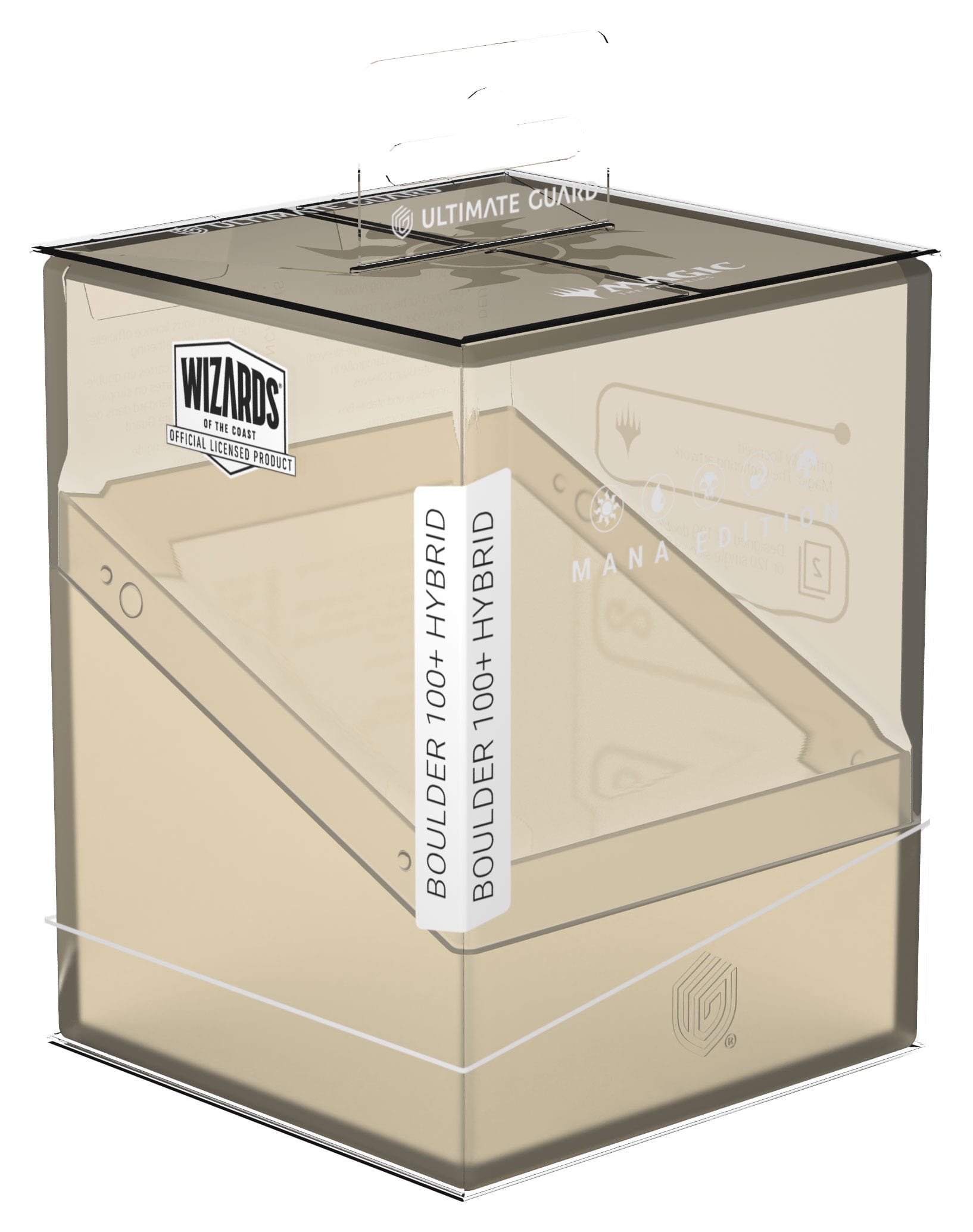 Ultimate Guard's Boulder 100+ Hybrid combines the completely transparent top of the Boulder Clear with a soft-touch base in the style of the original Boulder. The officially licensed MTG deck box is easy to open, but offers reliable protection for your cards thanks to its sturdy case and secure closure. The Boulder 100+ Hybrid holds up to 100 double-sleeved cards and is suitable for all Magic: The Gathering formats such as Commander (EDH), Standard or Modern.