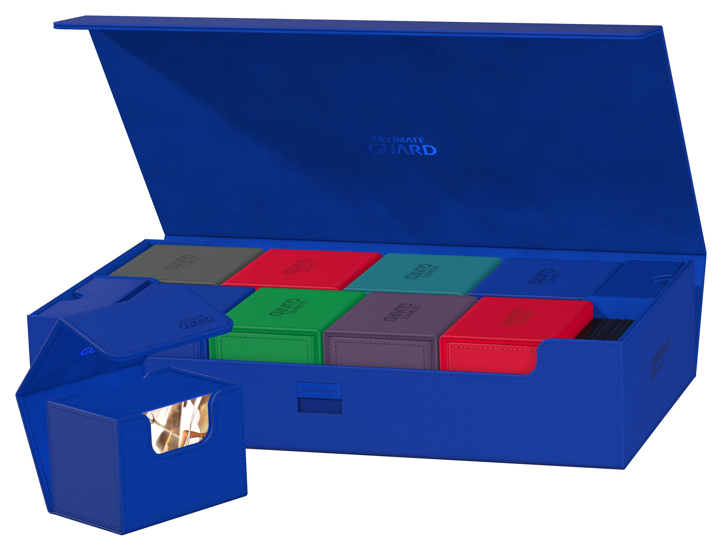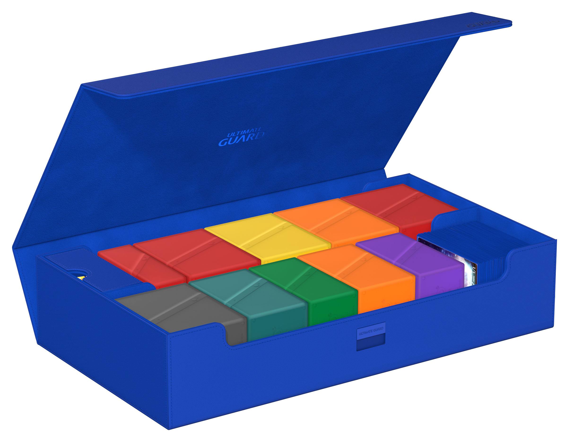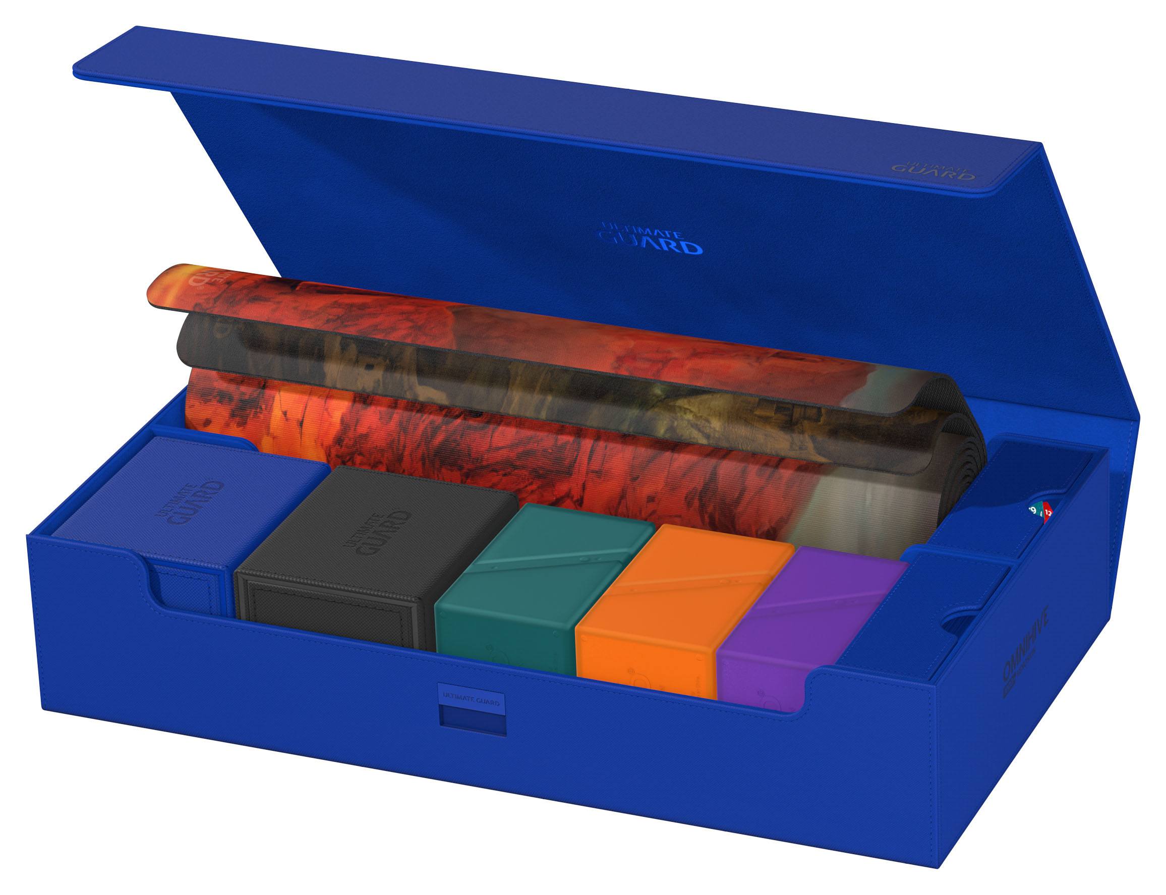Introducing the new Omnihive 1000+! The ultimate spacious and flexible box for storing large collections. This box can hold more than 1000 double- sleeved cards or carry multiple decks and/or Play-Mats plus other Ultimate Guard products like the Sidewinder 133+. Two removable, magnetic, adjustable and stackable trays make this box unique: it's adaptable for all kinds of games and formats and enables multiple different ways of storing and using your collection.