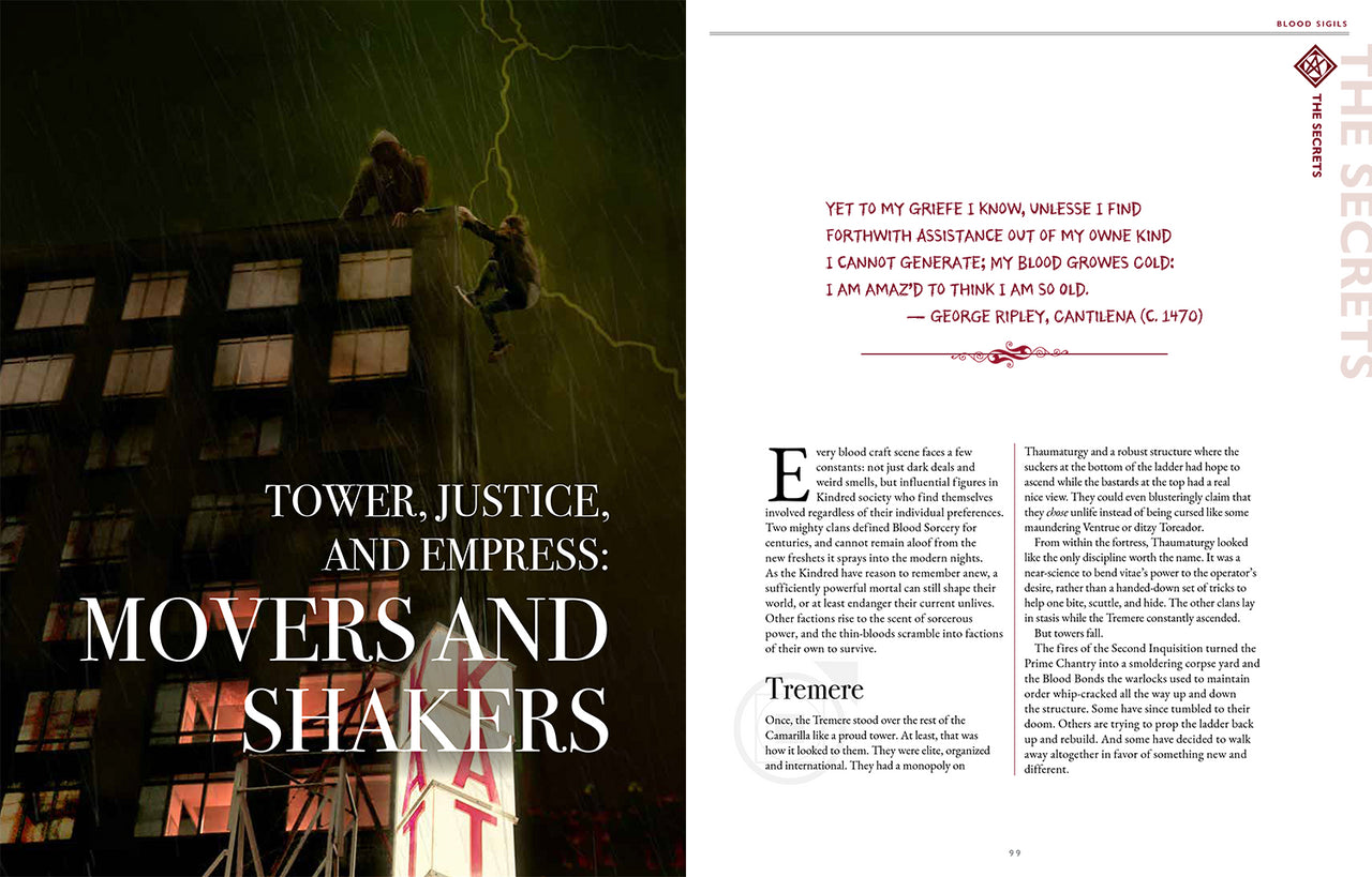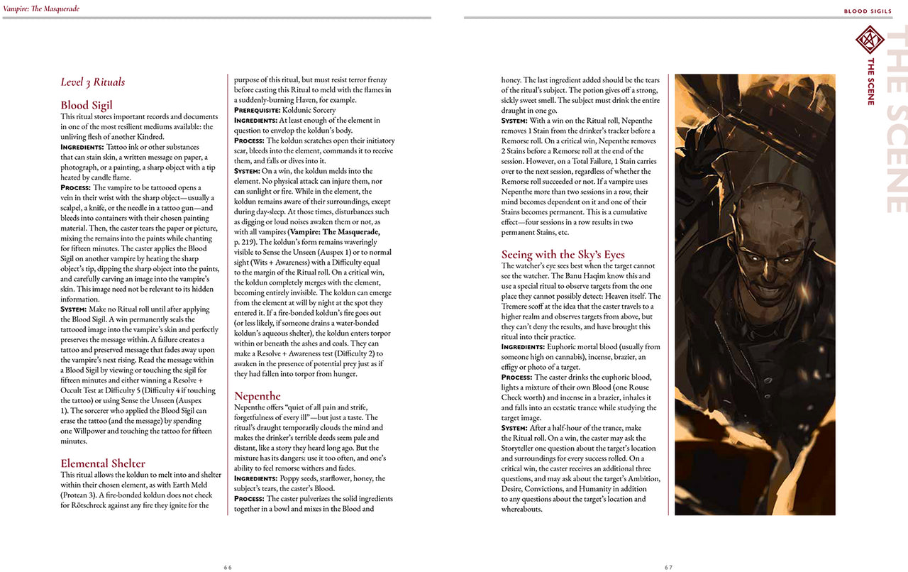 This book presents Blood Sorcery and Thin-Blood Alchemy for Vampire: The Masquerade.