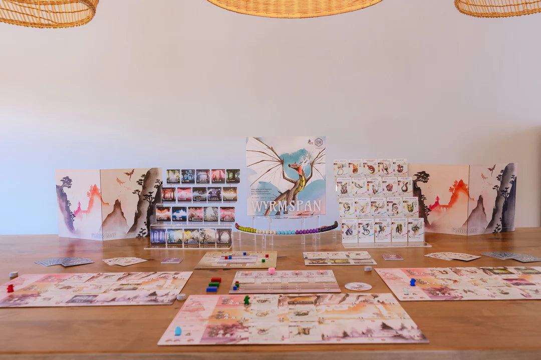 Wyrmspan plays up to 5 players, and it is flexible in size for various tables due to 3 smaller central boards (instead of a single big game board). Each player mat is 475x280mm (a little wider than Wingspan). It includes:
